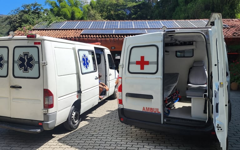 Ambulâncias, helicópteros e aviões para resgates médicos rápidos.